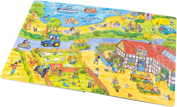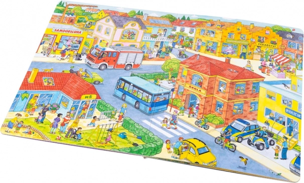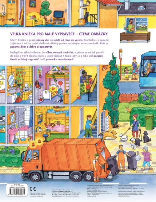 Ši didelio formato knyga puikiai tinka bendrai skaityti ir pasakoti. Vaikai susipažins su tuo, kas mieste vyksta nuo ryto iki vakaro – nuo šiukšliavežių darbo ir apsipirkimo, per darželį, statybas, ugniagesius ir policiją, iki popietinių pramogų parke bei išvykų prie ežero ar į ūkį. Kiekvienas puslapis kupinas paskatų pokalbiams ir detalių paieškai.