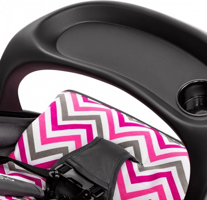 Penkių taškų diržai su minkštais paminkštinimais ir priekinė apsauga su padėklu didina saugumą ir patogumą. Konstrukcija atitinka EN 1888 standartą, patikrinta SGS laboratorijoje.