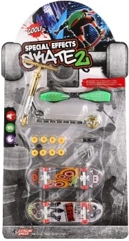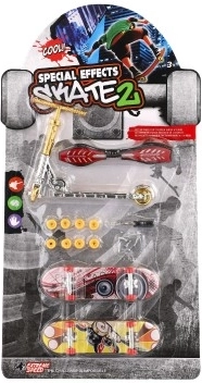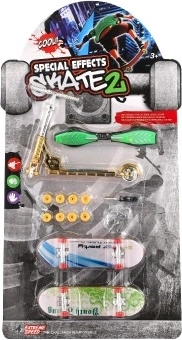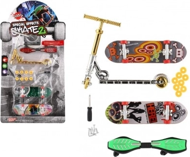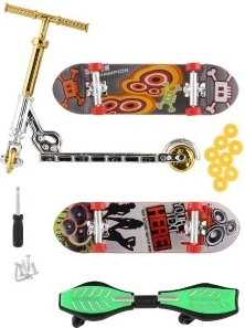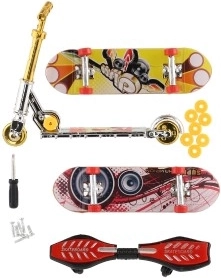 - 2× mini riedlentė, 1× pirštinis paspirtukas, 1× waveboardas, ratukai, varžteliai, mini atsuktuvas