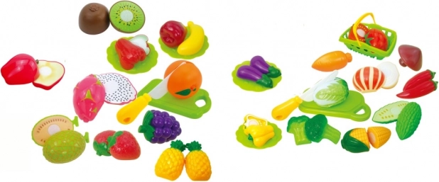 Linksmas ir edukacinis vaisių ir daržovių pjaustymo rinkinys iš tvirto plastiko padės vaikams lavinti smulkiąją motoriką, atpažinti maisto produktus ir saugiai „dirbti“ vaikiškoje virtuvėlėje. Kiekvienas gabalėlis sudarytas iš dviejų dalių, sujungtų lipnia juostele (velkro), todėl jį galima pakartotinai „pjaustyti“ naudojant saugų plastikinį peilį. Rinkinyje yra ir pjaustymo lentelė tikroviškam žaidimui „virėjas“.
