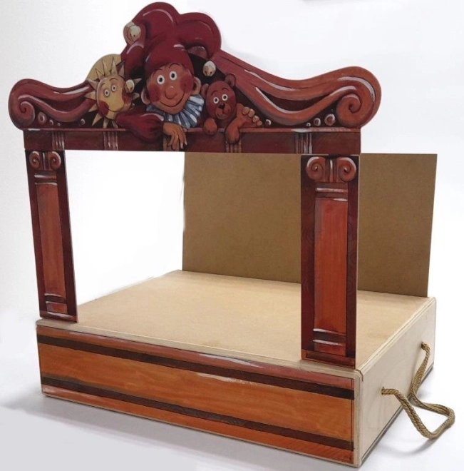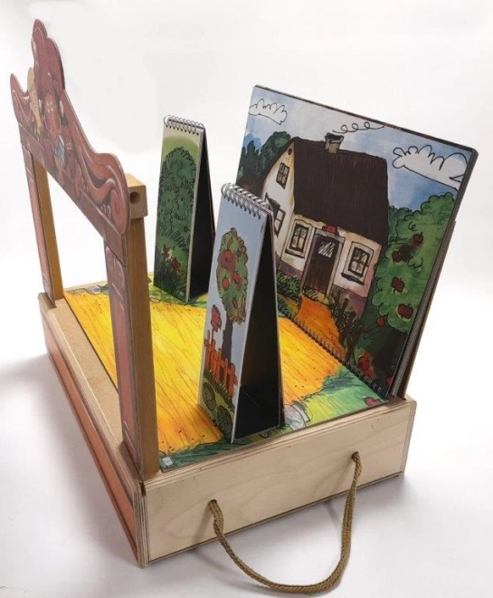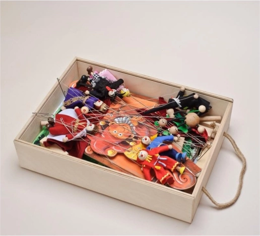 Rinkinyje rasite 14 medinių lėlių, 11 spalvingų scenų, proskėniją, uždangą ir šonines dekoracijas – viskas tvarkingai sudėta į medinę dėžę su rankena.