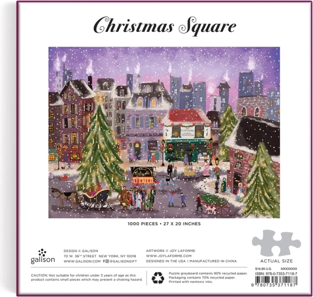 Kalėdinė dėlionė pagal Joy Laforme darbą vaizduoja gražų snieguotą kalėdinį miestelį su įžiebtais medeliais ir kalėdininkais. Puikiai tinka kaip dovana.
