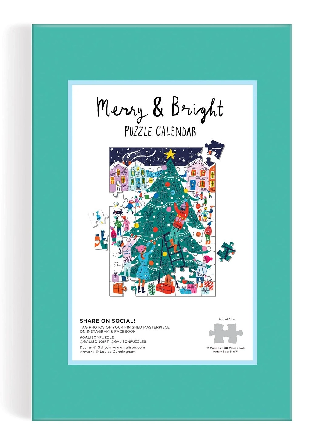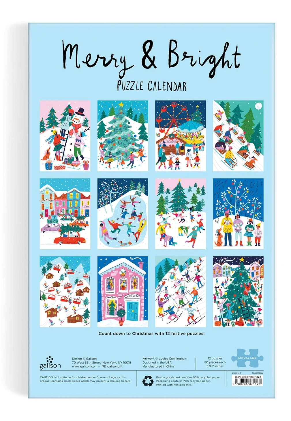 12 skirtingų dėlionių atskleidžia šventines scenas, kurios sužavės kiekvieną šeimą. Advento kalendorius Merry & Bright Puzzle puikiai tinka dovanai arba žiemos pramogoms. Kiekvienos dėlionės matmenys 12,7 x 17,8 cm, tinka vaikams nuo 6 metų.