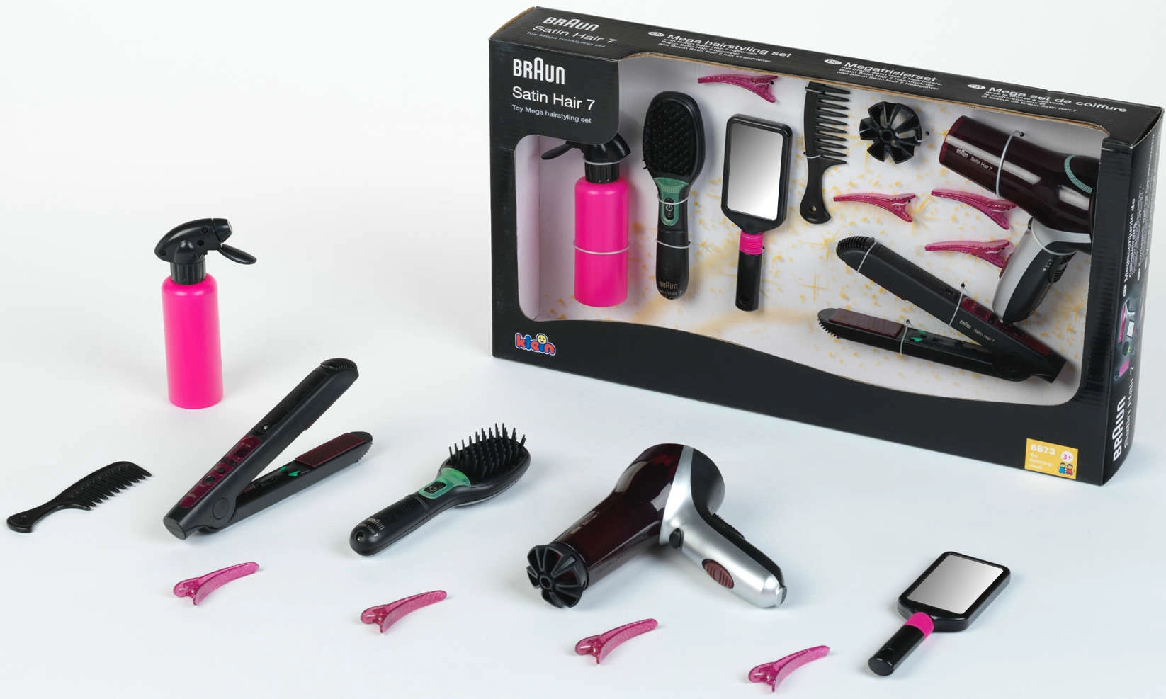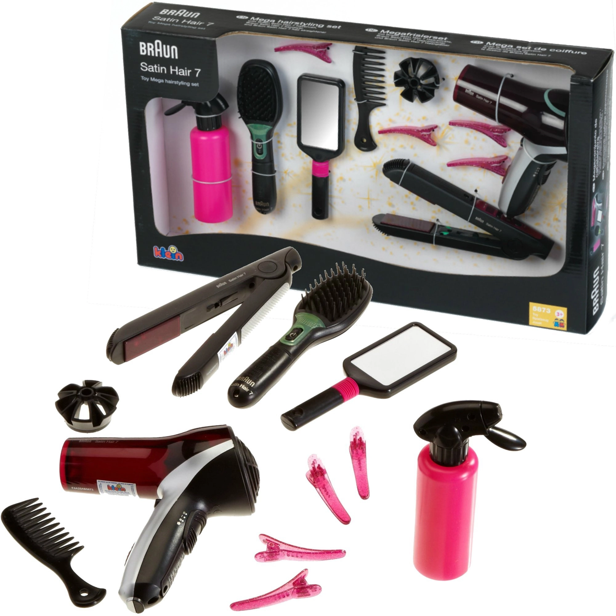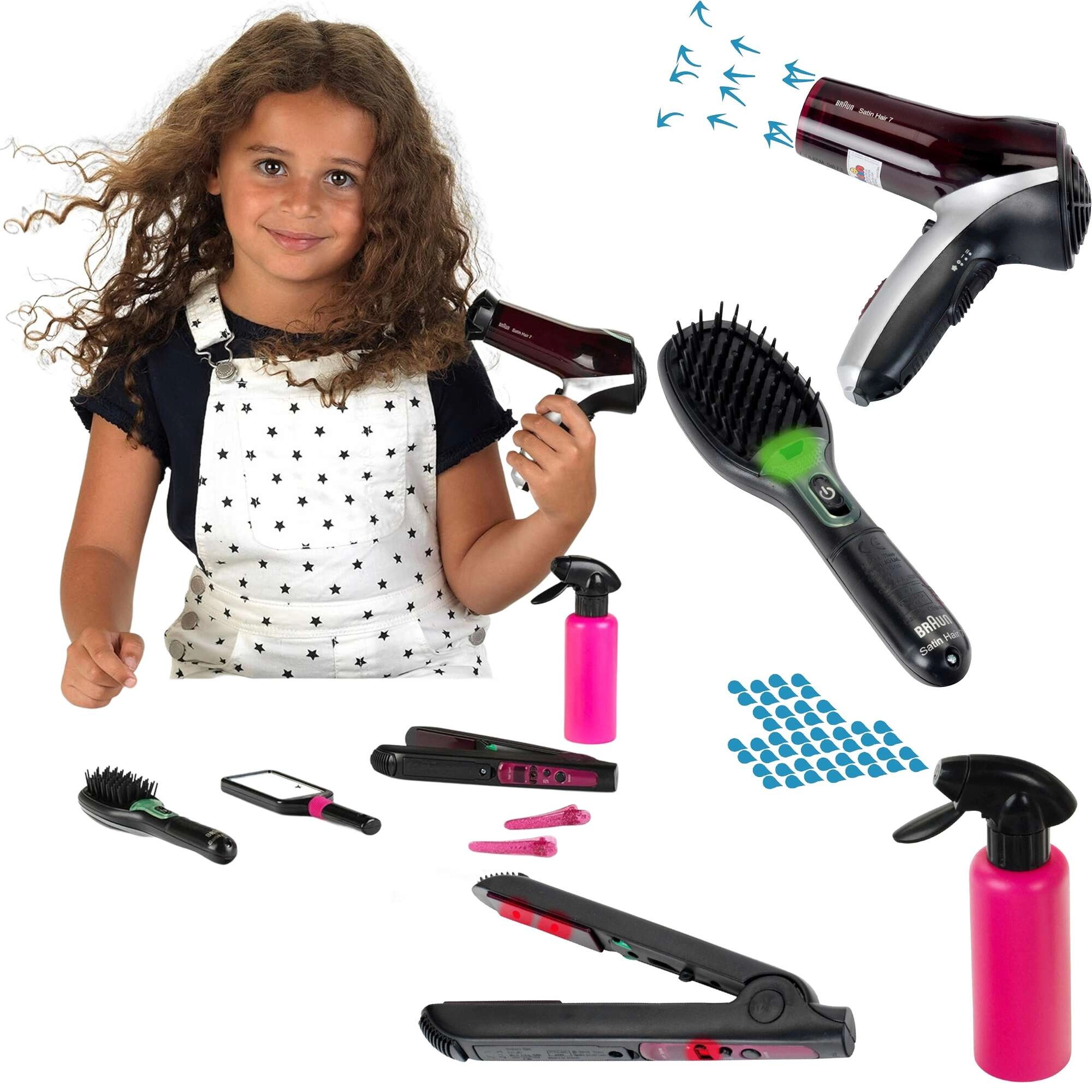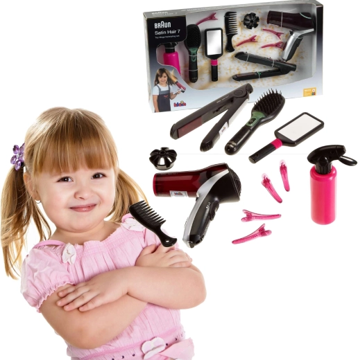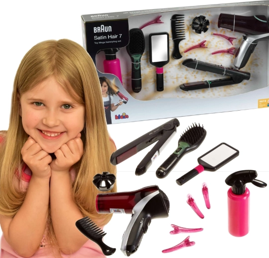 Didelis kirpimo rinkinys, įkvėptas BRAUN Satin Hair serijos, suteiks vaikams viską, ko reikia stilingoms šukuosenoms. Žaislai sukurti atsižvelgiant į saugumą ir imituoja tikrus įrankius – fenas, tiesintuvas ir šepetys veikia su baterijomis ir kuria realistinius šviesos ir garso efektus, tačiau šilumos ar oro srauto neskleidžia.