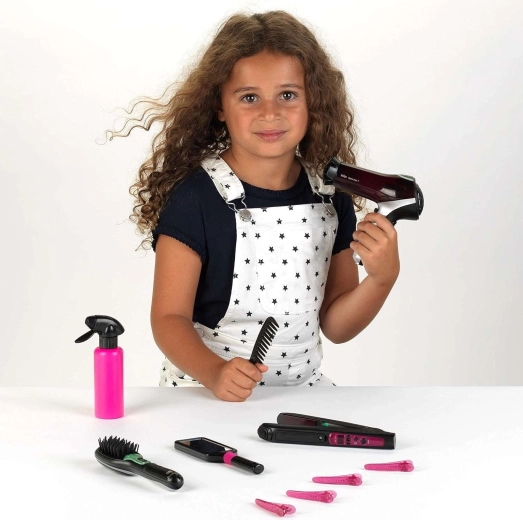 Pilnas vaikiškas kirpimo rinkinys iš KLEIN suteikia realistišką saloninį smagumą namuose. Įeina BRAUN fenas, plaukų tiesintuvas ir joninis šepetys, veikiantys su baterijomis ir turintys šviesos bei garso efektus, papildomai veidrodėlis, šukos, purkštukas, fono antgalis ir 4 blizgantys segtukai. Idealu vaidinti kirpyklą ir lavinti vaikų kūrybiškumą nuo 3 metų.
