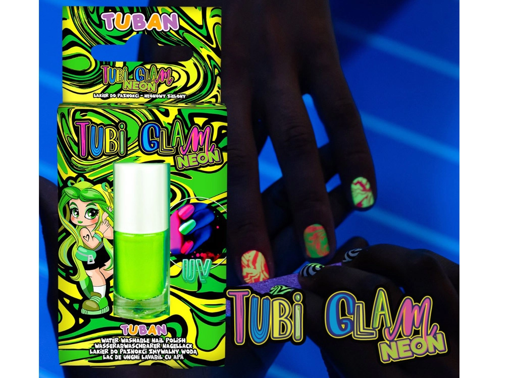 Atraskite žaismingą grožį su TUBI GLAM NEON nagų laku ryškiai žalia spalva. Jis pasižymi intensyvia neonine spalva, šviečia UV šviesoje ir yra saugus vaikų nagams. Lakas visiškai bekvapis, lengvai nuplaunamas vandeniu, o kartus skonis atgraso nuo nagų kramtymo.