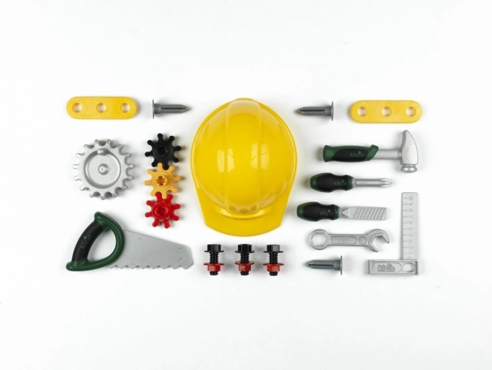 - Rinkinio turinys (20 dalių): darbo suolas, geltonas šalmas su reguliuojamu užsegimu, pjūklas, plaktukas, atsuktuvas, raktas, dilde, slankmatis, 12 statybinių detalių (varžtai, vinys, krumpliaračiai ir kt.).