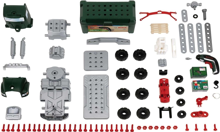 - Sunkvežimis, nuimama įrankių dėžė, priekaba, kranas, šakinis krautuvas su padėklu, vaikiškas gręžtuvas, varžtai ir statybinės detalės