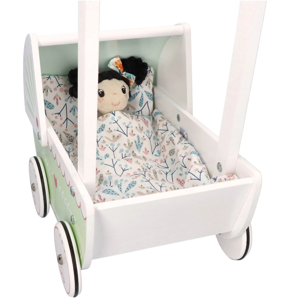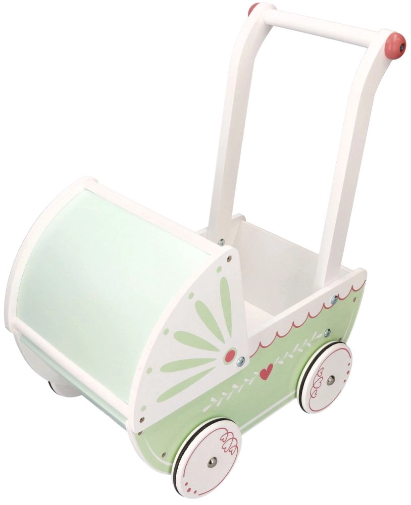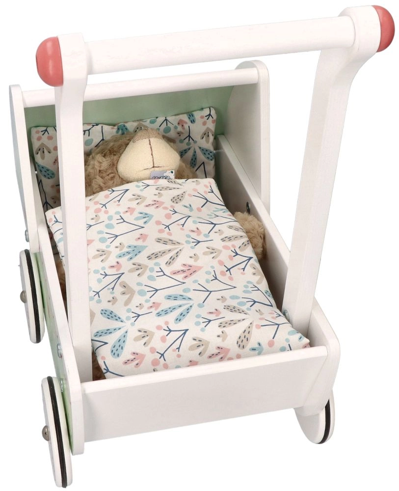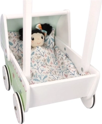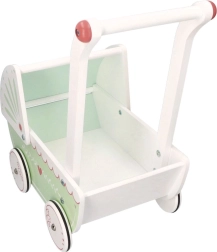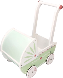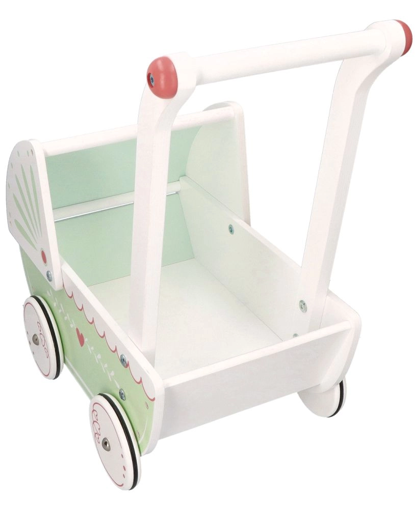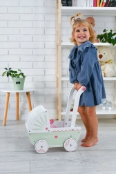 Vežimėlis turi tvirtą medinę konstrukciją, kuri užtikrina stabilumą ir saugumą žaidžiant. Idealiai tinka mažiems pradedantiesiems vaikščiotojams.
