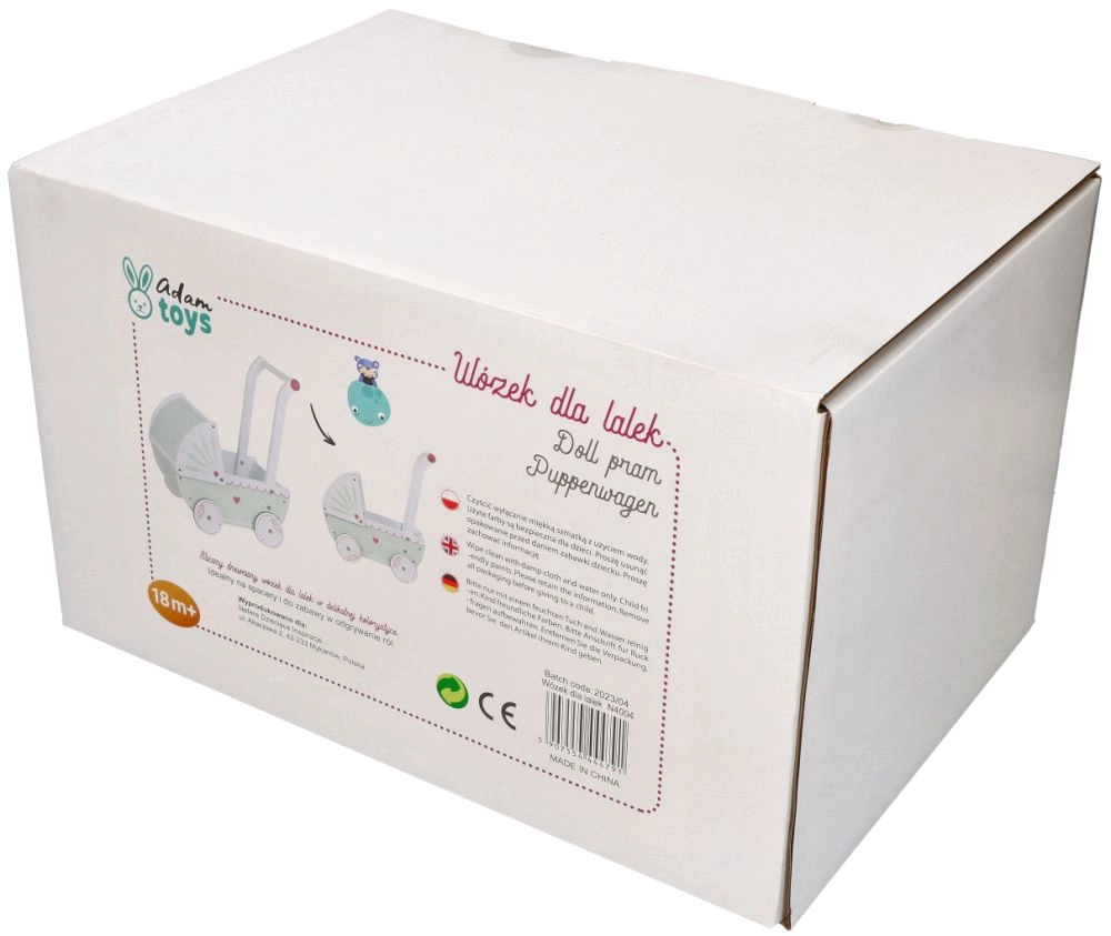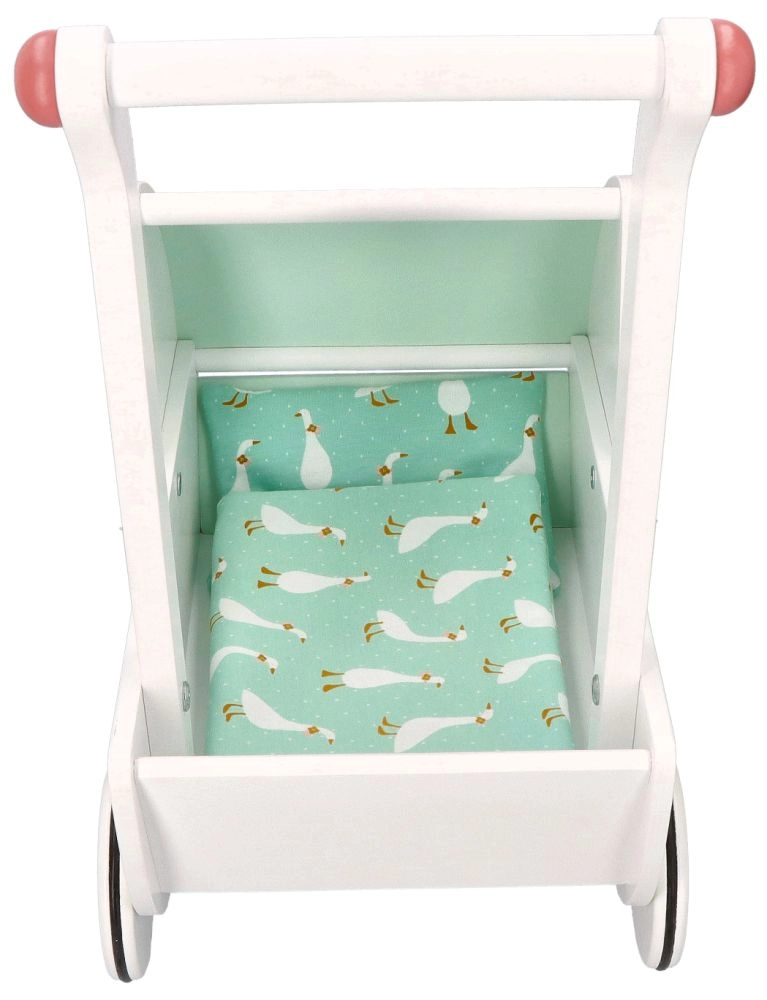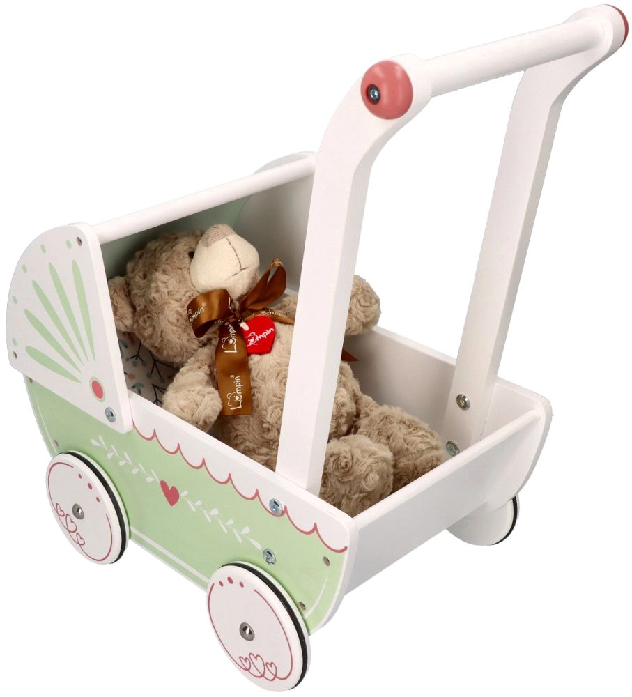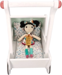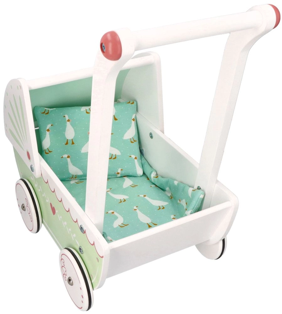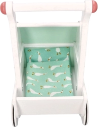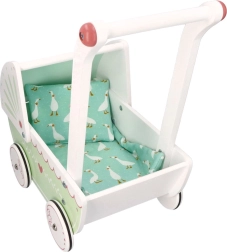 Vežimėlis turi tvirtą medinę konstrukciją, kuri užtikrina stabilumą ir saugumą žaidžiant. Idealiai tinka mažiems pradedantiesiems vaikščiotojams.