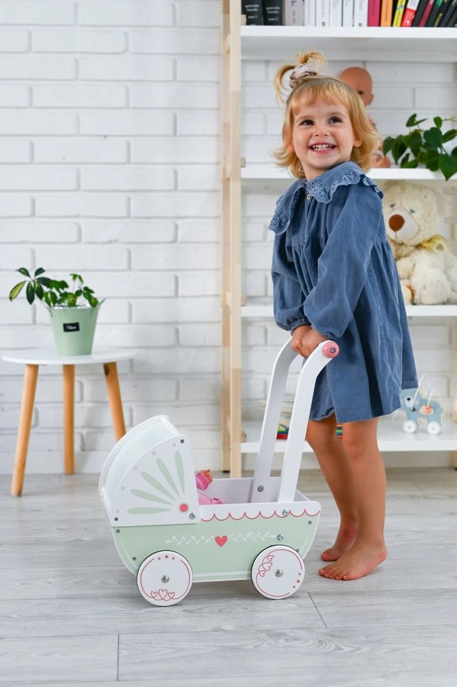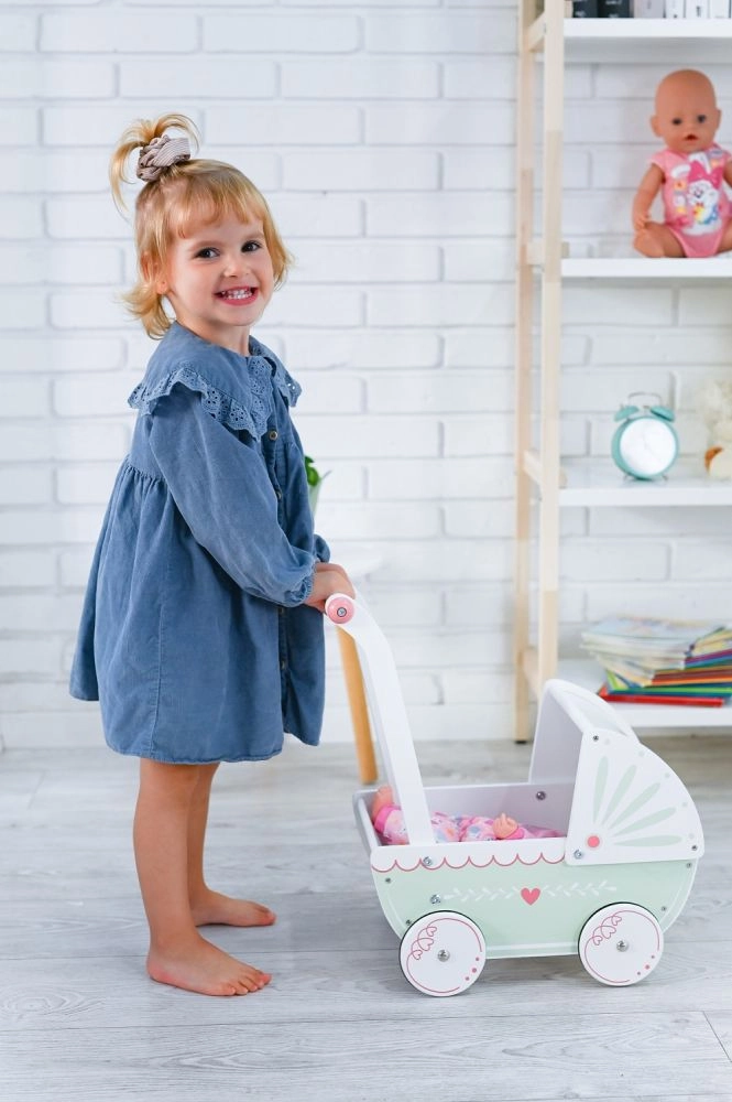 Šis medinis lėlių vežimėlis yra idealus žaislas vaikams, kurie mėgsta vaidmenų žaidimus ir rūpintis savo lėlėmis. Pagamintas iš kokybiškos medienos su gražiu dizainu, suteikia saugų ir smagų žaidimą.