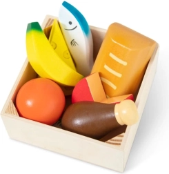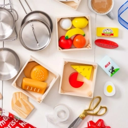 Šis medinių maisto produktų rinkinys turi keturias mažas dėžutes, kuriose yra įvairūs produktai, tokie kaip pienas, sūris ir duona. Jis sukurtas kūrybiškiems žaidimams, kurie padeda vaikams lavinti smulkiąją motoriką ir vaizduotę.