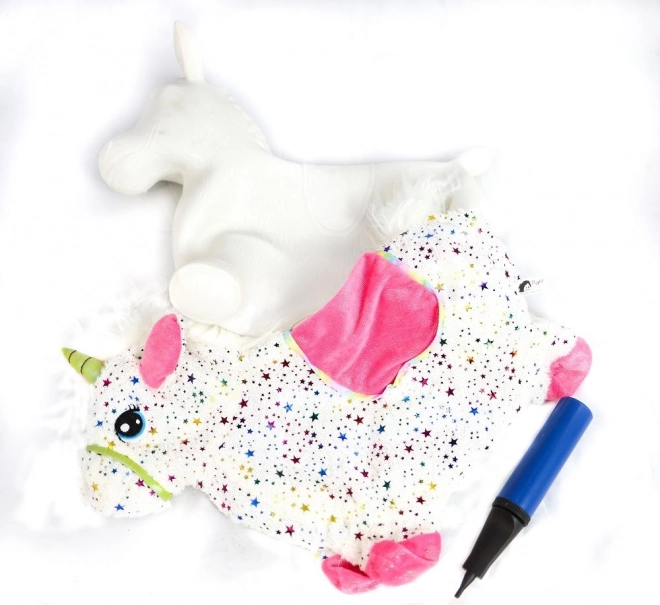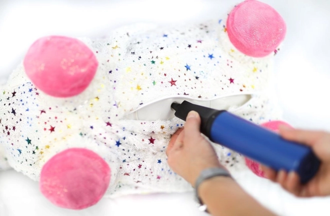 Šokinėjantis vienaragis lengvai pripučiamas pridėtu rankiniu siurbliu. Per akimirką paruoštas žaidimui – elastingas branduolys, patogus laikymas ir išmatavimai 60 × 50 × 25 cm.