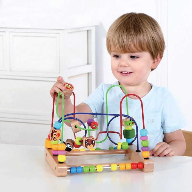 Medinis labirintas su gyvūnais – idealiai tinka mažiesiems tyrinėtojams nuo 18 mėnesių. Dėl ryškių karoliukų ir mielų gyvūnėlių draugų vaikai žaismingai lavina akies–rankenos koordinaciją, mokosi atpažinti spalvas ir formas. Žaidimas su karoliukais taip pat padeda žengti pirmuosius žingsnius skaičiavimo link ir natūraliai ugdo loginį mąstymą.