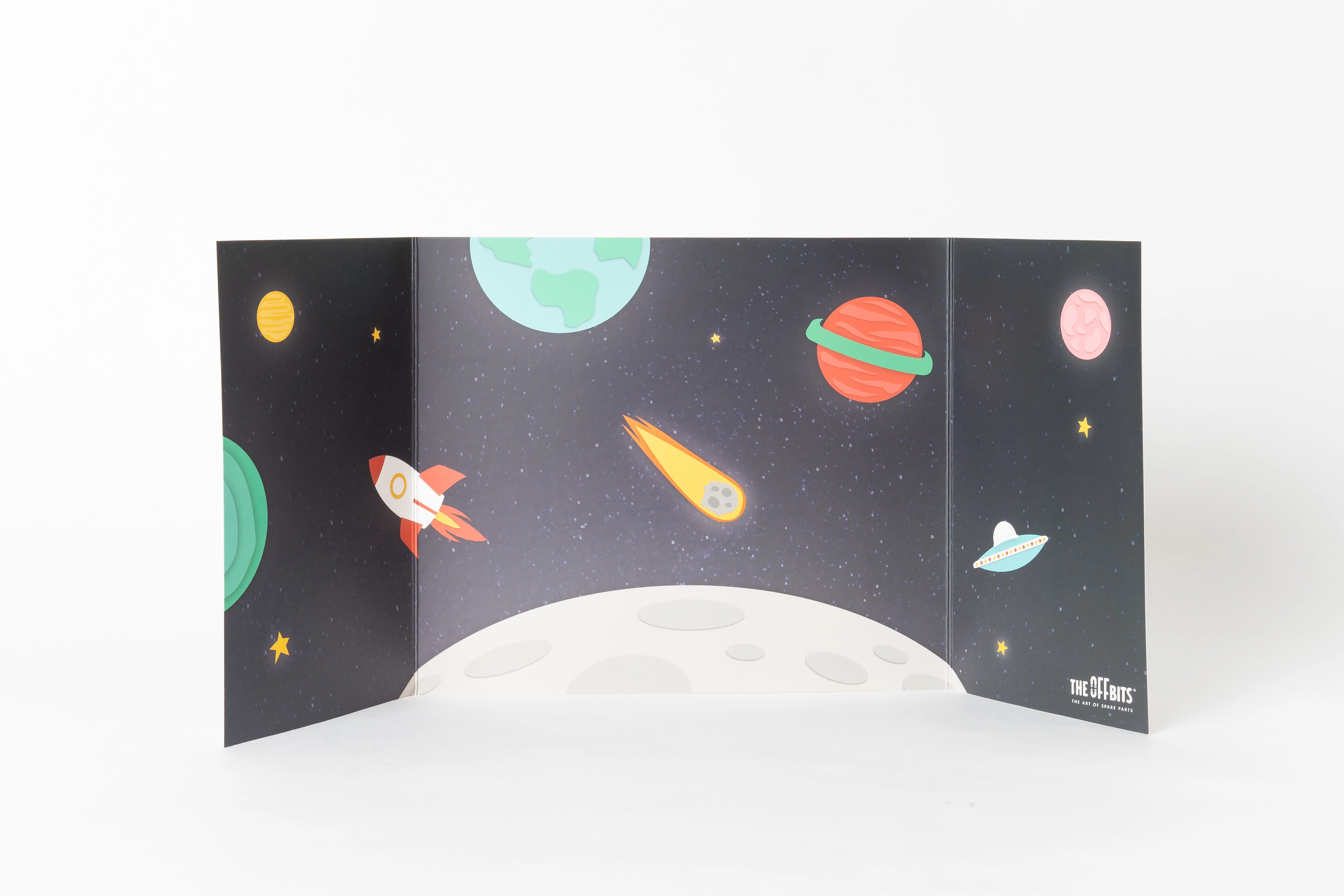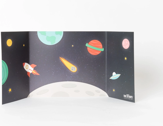 Lankstomas kartoninis fonas su kosmoso motyvu sukuria įspūdingą aplinką žaidimams ir baigtų modelių fotografavimui. Stabili trijų panelių konstrukcija praplečia žaidimų pasaulį.
