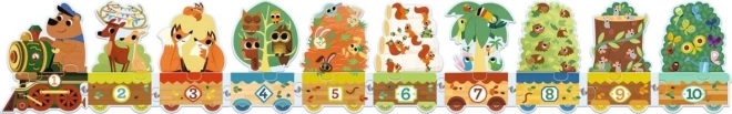 - Žaismingas skaičių mokymasis: vagonai su skaičiais 1–9 ir atitinkamais gyvūnų kiekiais.