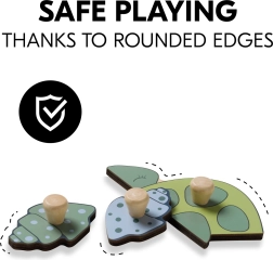 Kiekviena detalė turi medinį knopkelį, kuris vaikams palengvina paėmimą ir tikslų įdėjimą į reikiamą vietą – idealiai tinka pradedantiesiems.