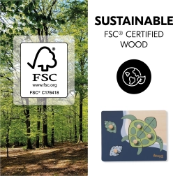 Žaislas pagamintas iš FSC sertifikuotos medienos, todėl jis draugiškas gamtai ir patvarus kasdieniam žaidimui. Švelni žalių ir mėlynų atspalvių paletė žadina smalsumą ir kartu ramina.