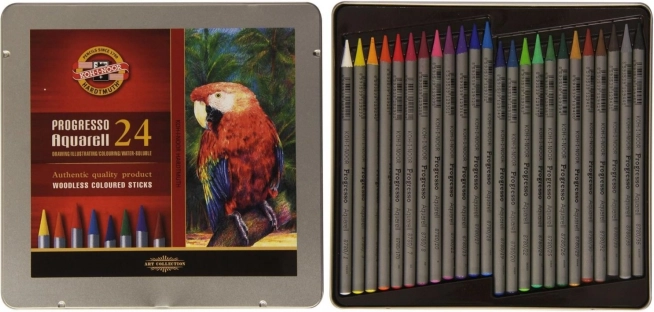 KOH-I-NOOR Progresso Aquarell meninių pastelelių rinkinys siūlo 24 pastelės elegantiškoje metalinėje dėžutėje, idealiai tinka pradedantiesiems ir patyrusiems menininkams.