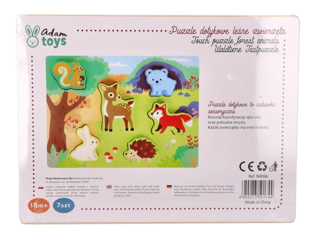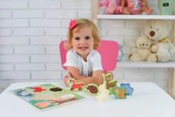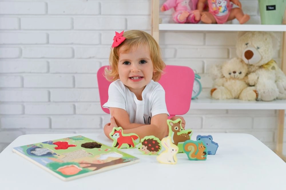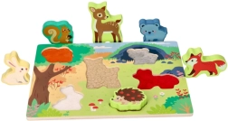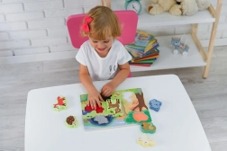 Dėl patvaraus lakuoto paviršiaus ir glotnių briaunų žaislas tinkamas kasdieniams žaidimams. Skatina akies–rankos koordinaciją, kantrybę ir susikaupimą, o vaikai natūraliai susipažįsta su miško gyvūnais.