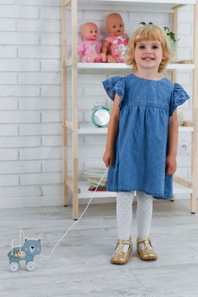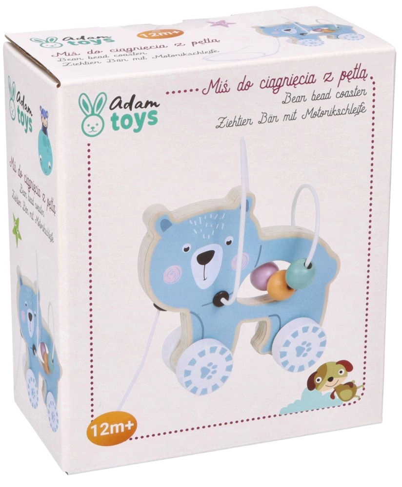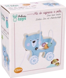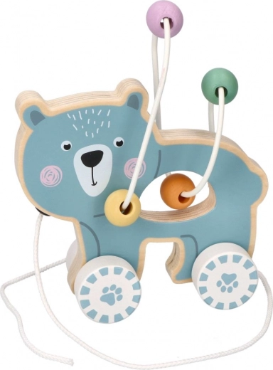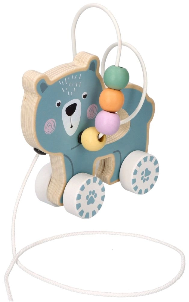 Medinis žaislas su ratukais ir meškučiu patraukia dėmesį ir skatina vaiką judėti.