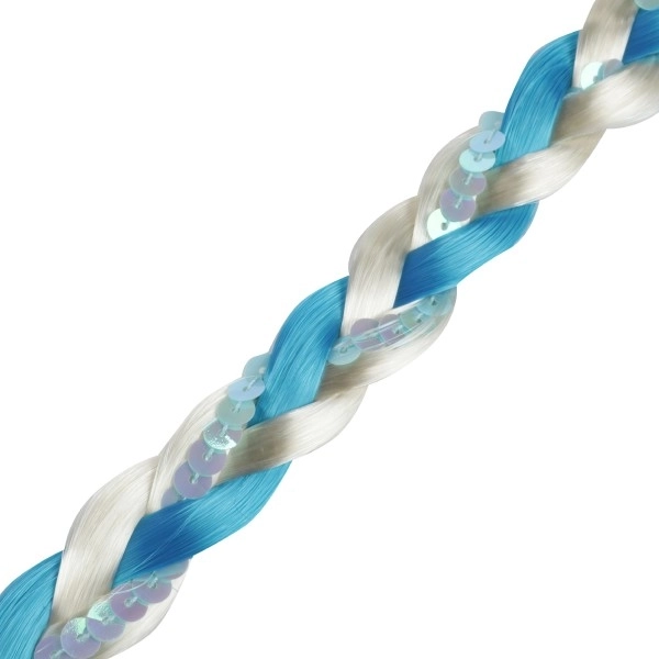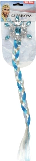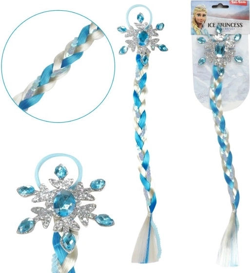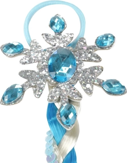 Ledinės Princesės prisegama kasos sruoga sukurta iš mėlynai baltų sruogų, papuošta teminėmis snaigėmis ir blizgučiais. Dėl gumelės ją lengva pritvirtinti, o nešiojimas – patogus.