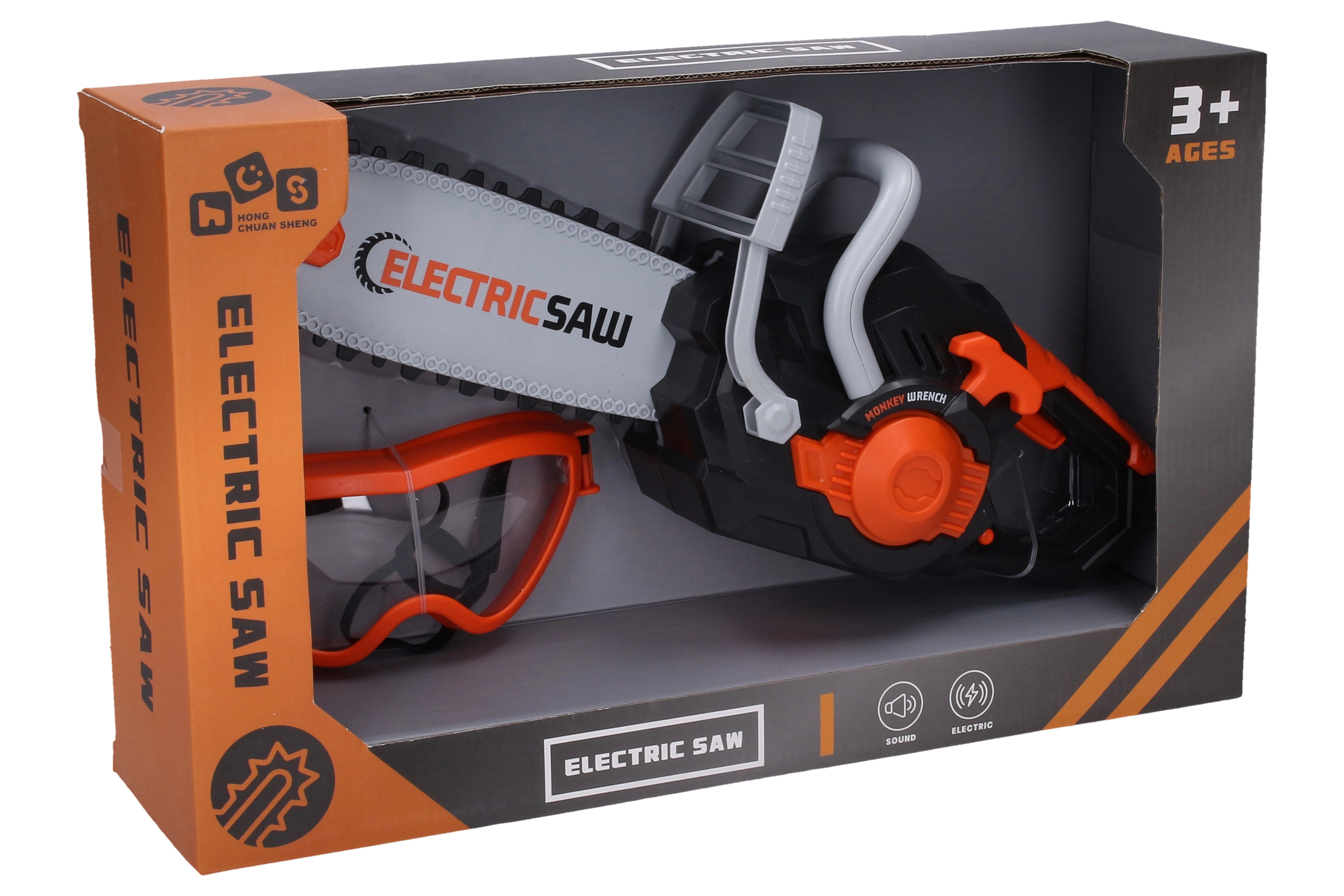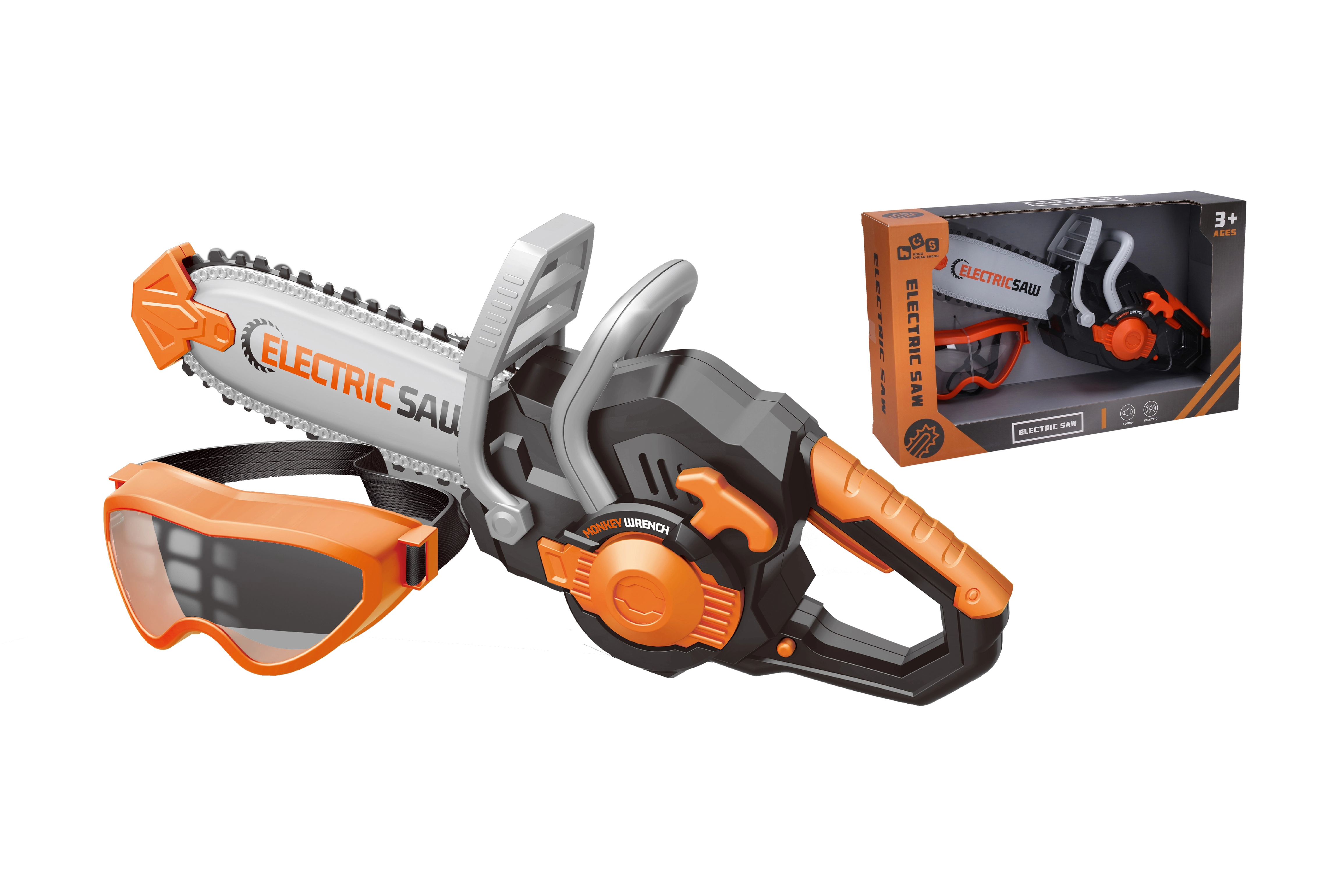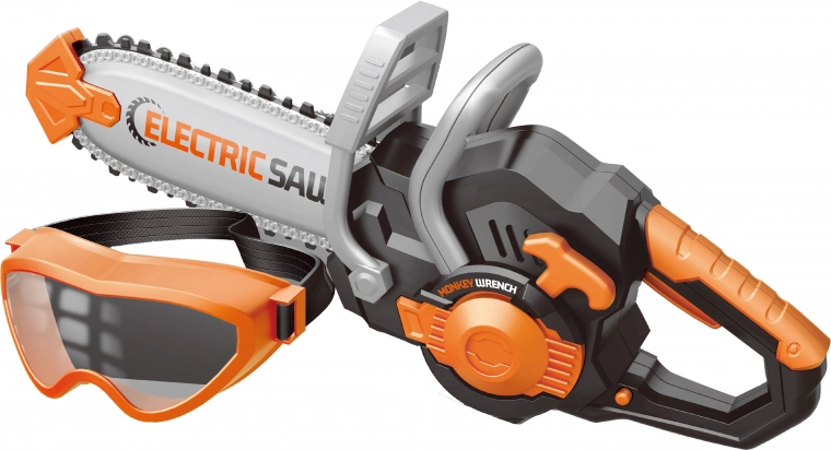 Apsauginiai akiniai užtikrina saugumą žaidžiant. Mygtukas kairėje pusėje leidžia lengvai įjungti pjūklą, kas prisideda prie realistiškos žaidimo patirties.