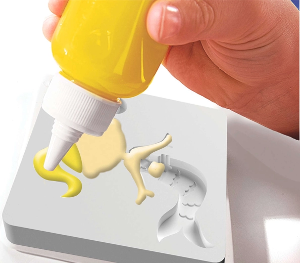 Užpildykite formeles spalvotais geliais, panardinkite į paruoštą tirpalą ir stebėkite, kaip plokščias piešinys virsta minkšta 3D dekoracija. Paprasta, greita ir smagu.