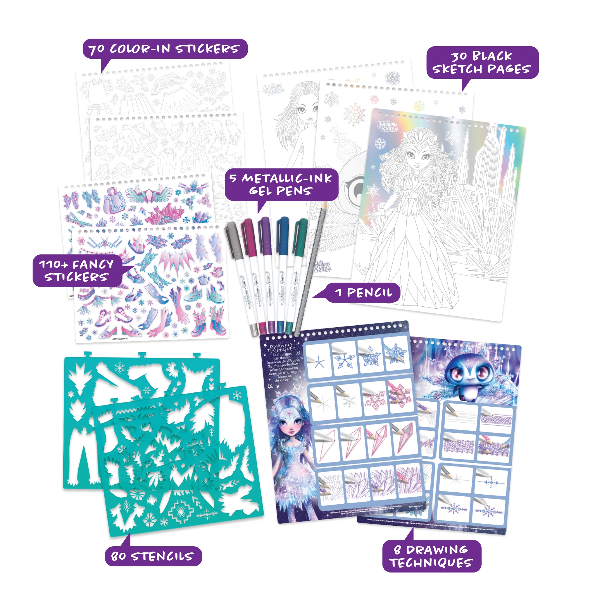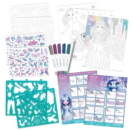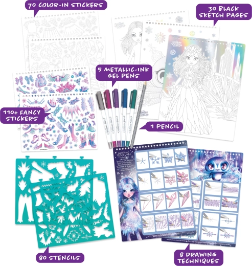 Į pakuotę įtraukti gausūs priedai: metaliniai geliniai rašikliai įspūdingoms detalėms, plastikiniai trafaretai tiksliems kontūrams, lipdukai, įskaitant ir skirtus nuspalvinti, bei pieštukas eskizams. Teminiai puslapiai su personažu Iceana vilioja spalvinti, dekoruoti ir kurti savo iliustracijas.