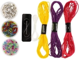 - varpeliai, elastinė virvelė, 3 spalvotos medvilninės gijos, jungiamieji žiedeliai, 2 indeliai su karoliukais, adata, instrukcijos