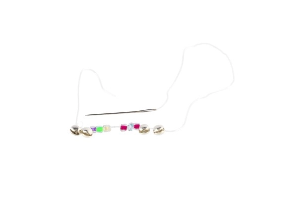 - plastikas, tekstilė (medvilninės gijos), metaliniai elementai (žiedeliai, adata)