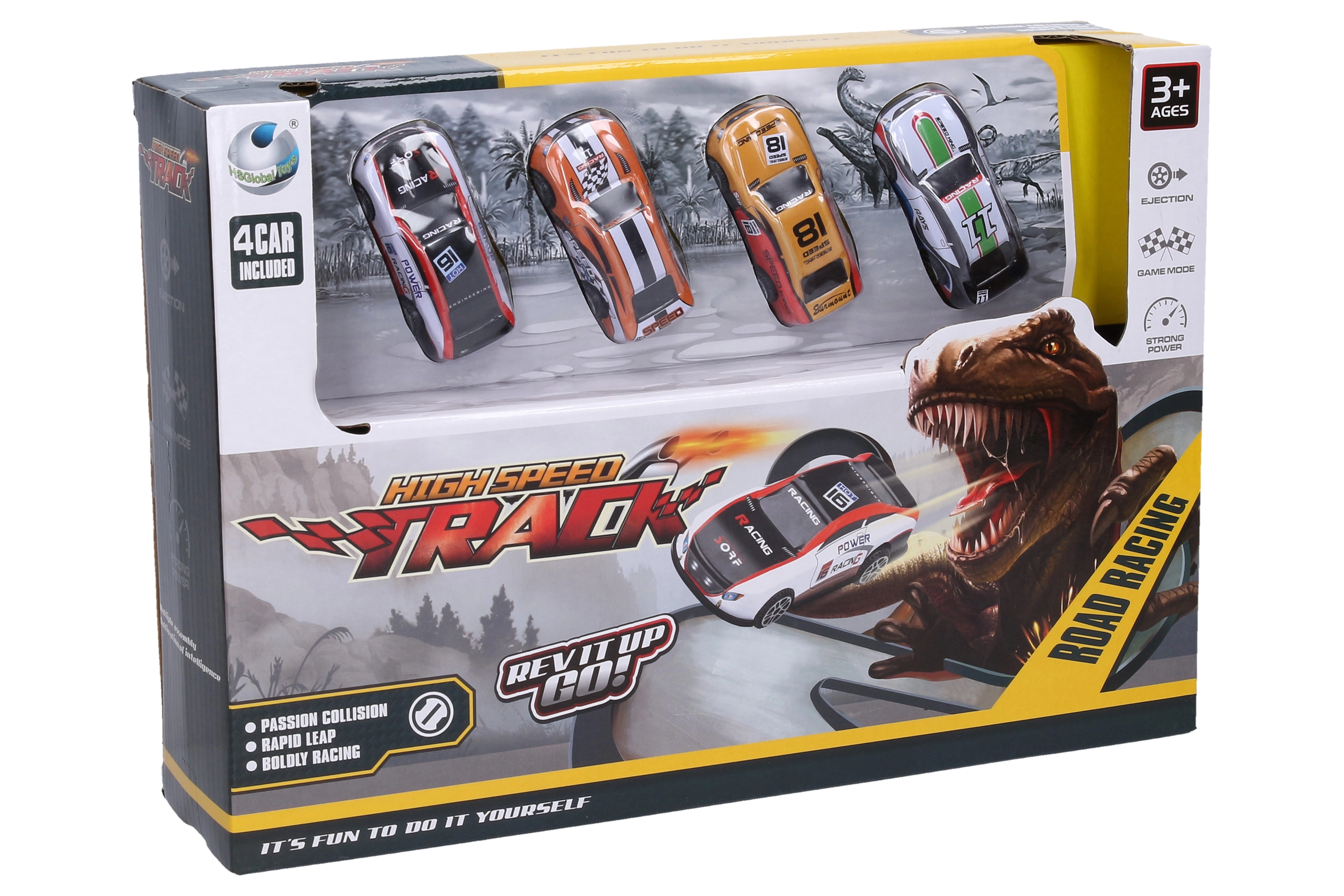 Atraskite įtemptą važiavimą su dinozaurų motyvo šaudymo trasa. Vaikams patiks greiti startai ir lenktynės dėl mechaninio paleidimo, kuris žaidimui suteikia dinamikos. Rinkinyje yra 4 metaliniai automobiliukai, tad jis puikiai tinka tiek žaidžiant vienam, tiek su draugais.