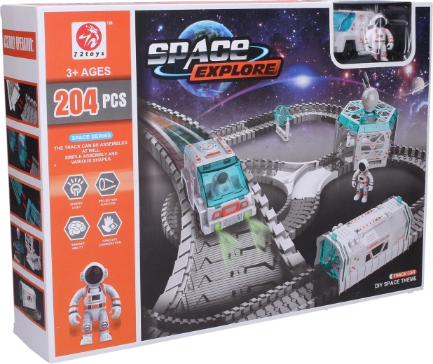 Atraskite nuotykius kosmose su šia kosmine lenktynių trasa, kurios matmenys 85 × 75 × 32 cm. Rinkinyje yra automobilis, astronauto figūrėlė ir veikiantis projektorius su šviesos efektais. Trasą galima laisvai surinkti į įvairias formas, todėl pramogos niekada nesibaigs.