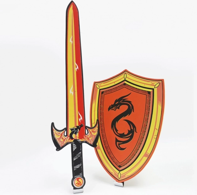Ši vaikiška rinkinio sudėtis: putplastinis kardas ir skydas su patraukliu drakono motyvu. Lengva putplasčio konstrukcija skatina saugų žaidimą be susižalojimo rizikos ir tinka vaikams, mėgstantiems riteriškus nuotykius, samurajų žaidimus ir persirengimo pramogas.