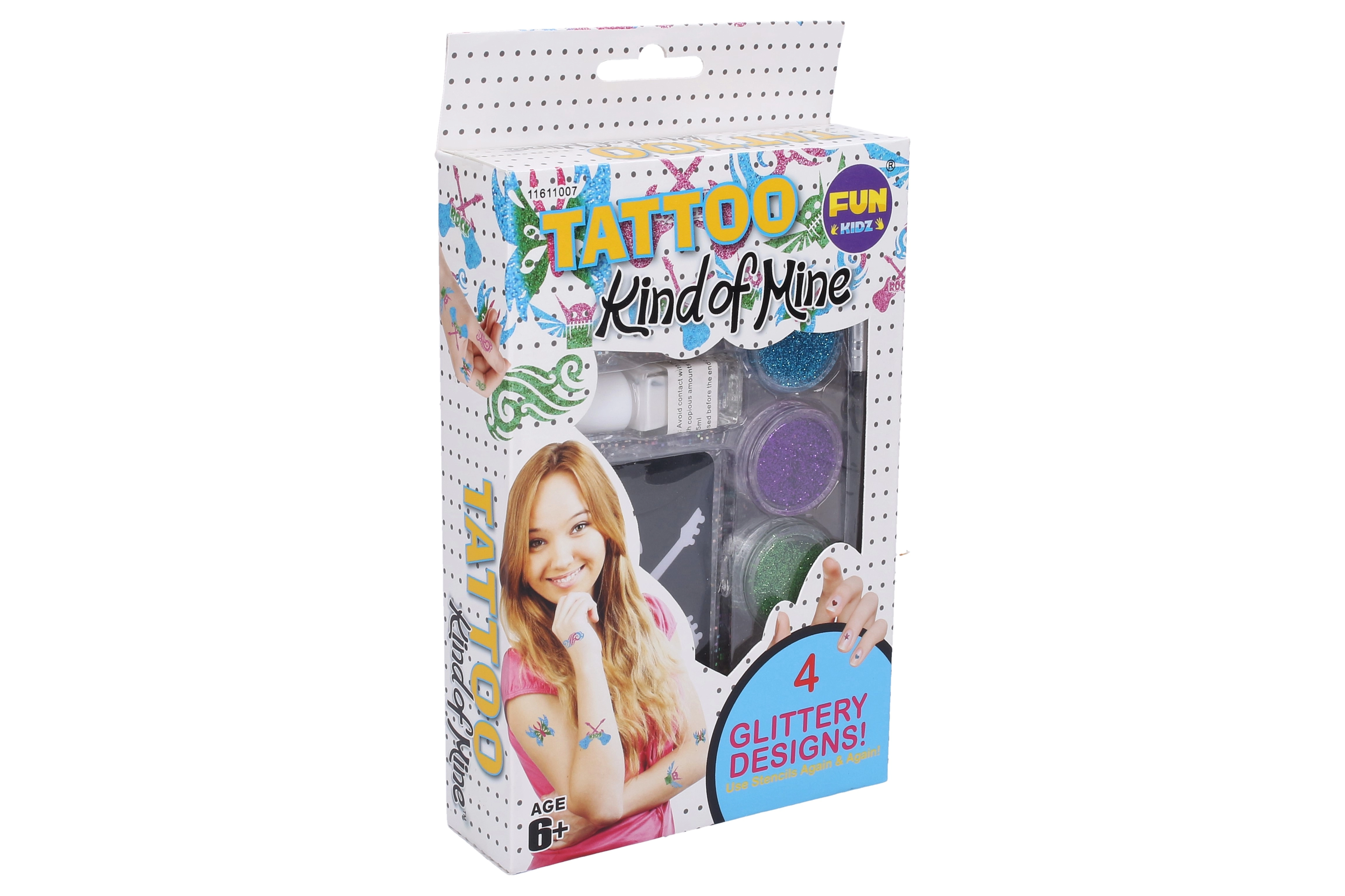 Akimirksniu tapk spindinčia žvaigžde su šiuo laikino tatuiravimo rinkiniu. Jame rasi 4 daugkartinio naudojimo trafaretus, blizgučius 3 spalvų, tatuiruočių klijus ir teptuką lengvam užtepimui – idealiai tinka mergaitėms nuo 6 metų.