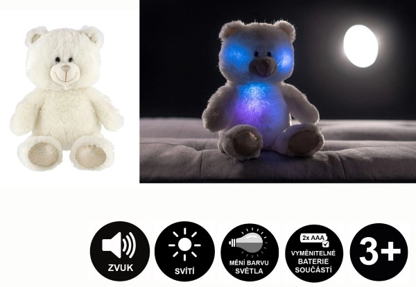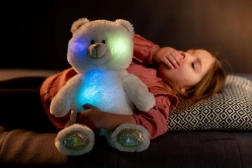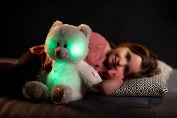 Meškiukas šviečia ir tamsoje keičia spalvas, suteikdamas saugumo ir jaukumo jausmą.