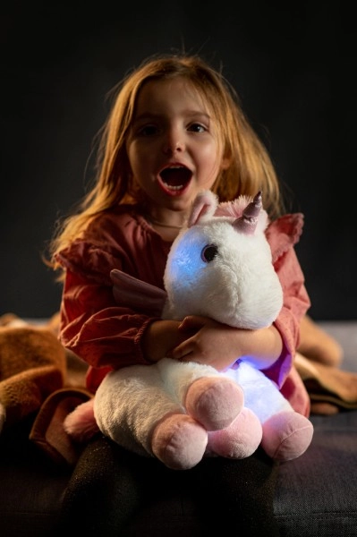 Pradžiuginkite savo vaikus pliušiniu vienaragiu, sukurtu glėbiams ir suteikiančiu jaukumą kaip naktinė lemputė. Vienaragis turi minkštą baltą kailį su rožiniais akcentais, o paspaudus letenėlę, skamba atpalaiduojanti muzika. Jis keičia spalvas ir šviečia, sukuriant magišką atmosferą.