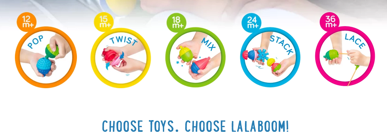 Lalaboom konstruktorius – tai unikalus edukacinis žaislas, padedantis lavinti visus vaiko pojūčius – ypač regą, klausą ir lytėjimą. Vaikai gali mokytis ir atrasti aplinkos pojūčius savo tempu dėl įvairių spalvų, formų ir tekstūrų, kurios suteikia įvairialypius lytėjimo pojūčius.