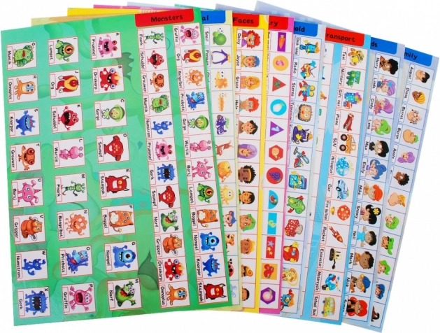 Iliustruotos kortelės su kategorijomis (veidai, formos, transportas, šeima, pabaisos) padeda lavinti žodyną, dėmesį ir gebėjimą kurti asociacijas.