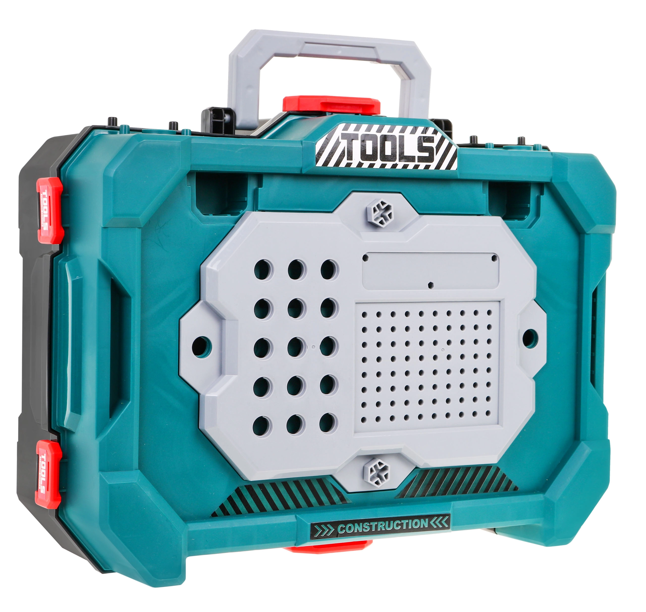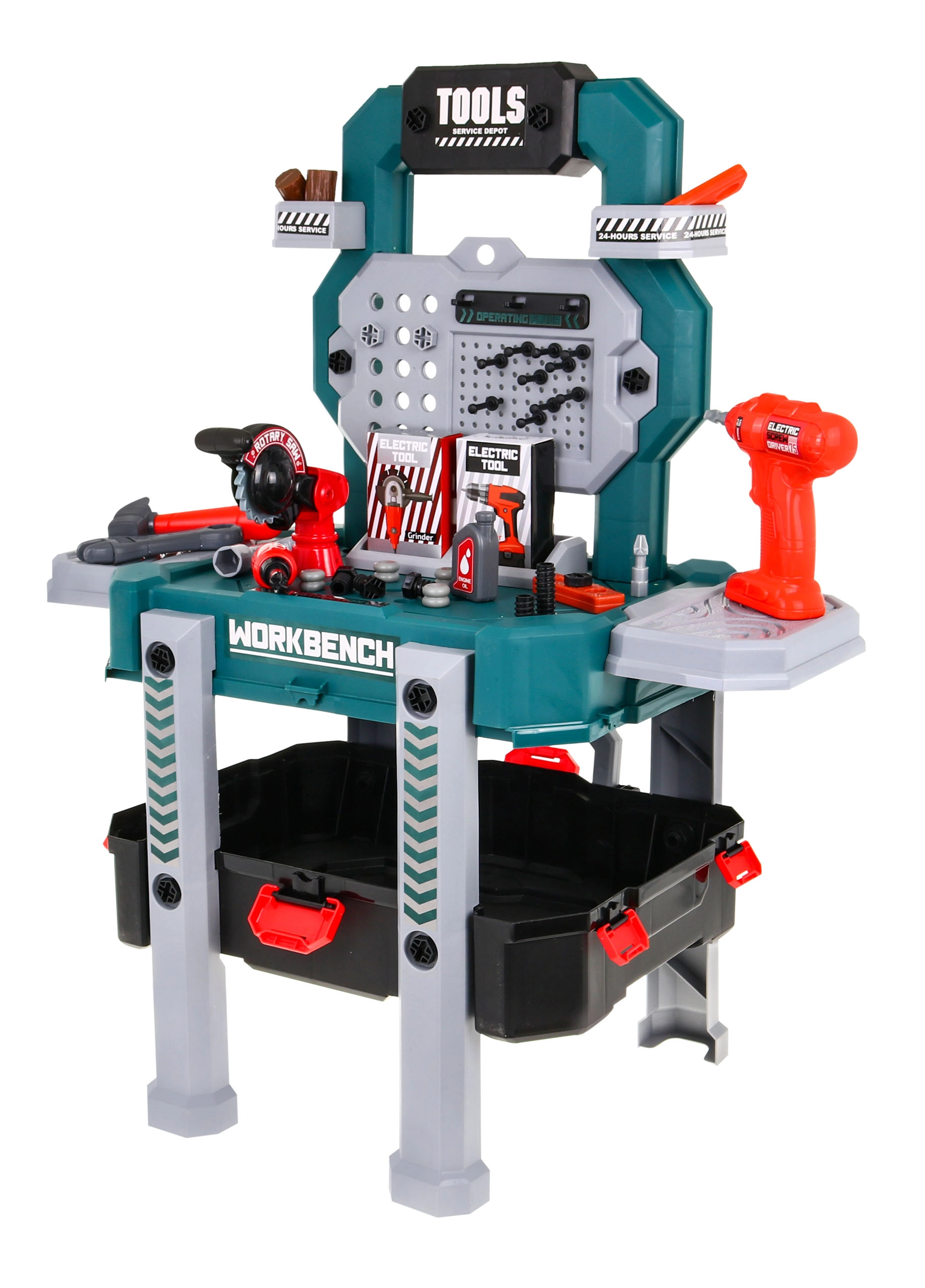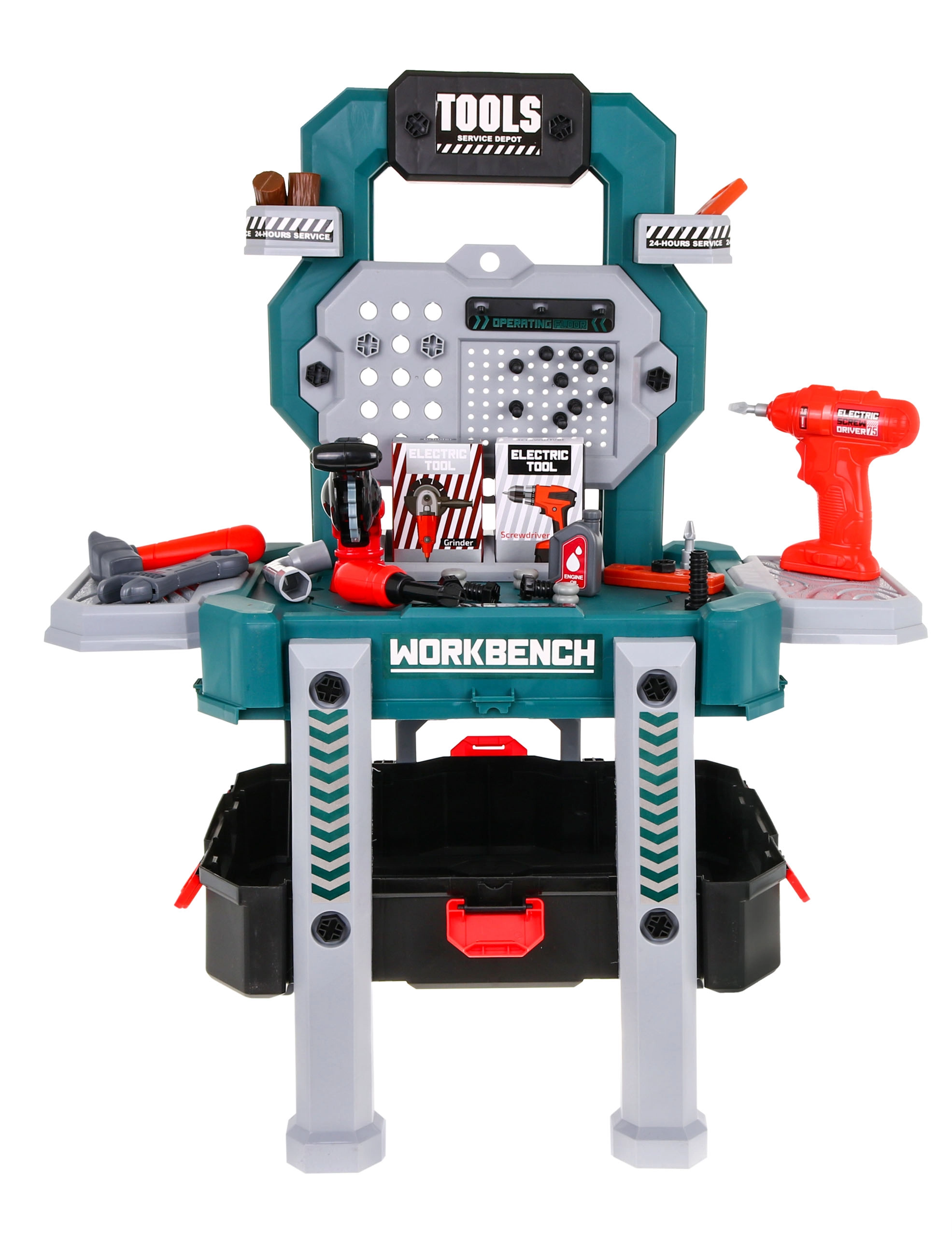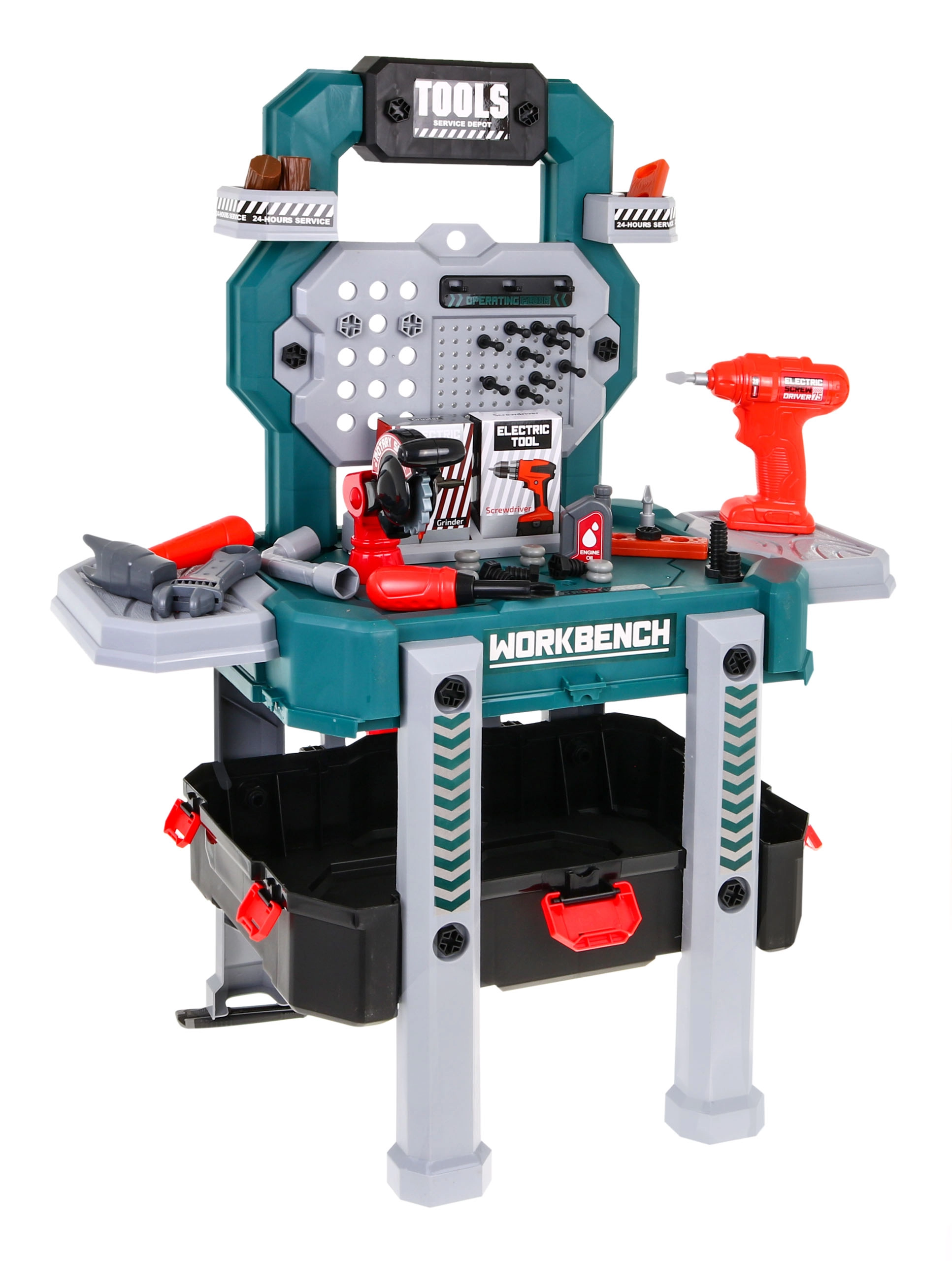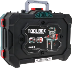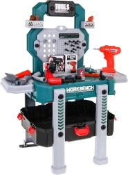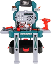 Atraskite universalų meistravimo rinkinį, kuris akimirksniu iš nešiojamo lagaminėlio virsta stabiliu darbo stovu su laikymo skyreliais. Vaikai mėgausis tikroviškais gręžtuvo–suktuko garsais su dviem keičiama is antgaliais ir saugiai, žaismingai išbandys darbą su įrankiais.