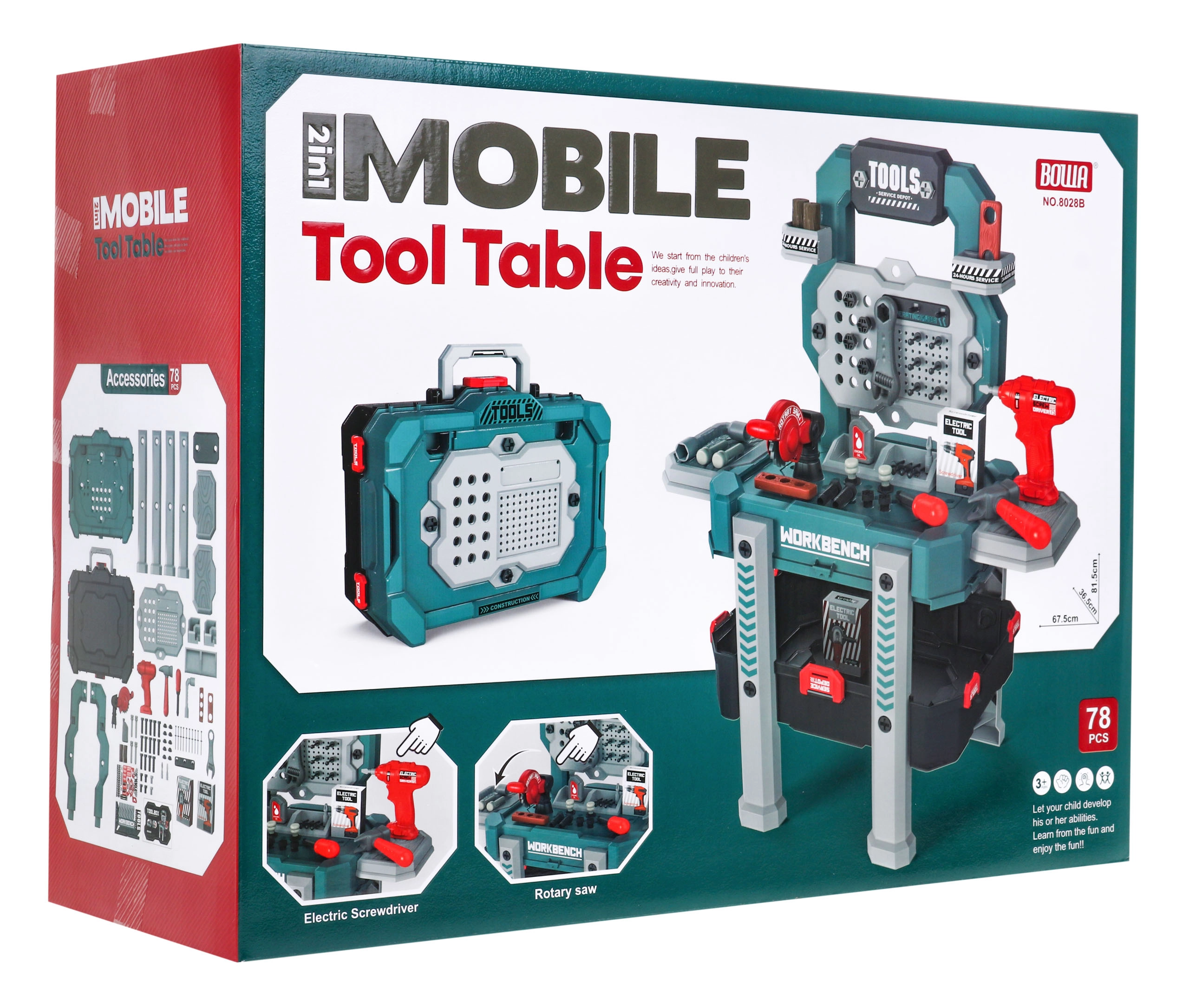 Komplekte yra 78 detalės, įskaitant pjūklą, plaktuką, atsuktuvą, raktus, varžtus ir medines „lenteles“. Po žaidimo viską lengva sudėti į didelį lagaminėlį su rankena. Puikiai lavina smulkiąją motoriką, kūrybiškumą ir vaidybinius įgūdžius.