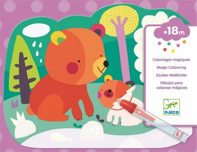 DJeco vandens spalvinimo kortelės suteikia vaikams nuo 18 mėnesių paprastą ir švarią kūrybą be dažų. Ant keturių tvirtų 21 × 26 cm kortelių, kontaktavus su vandeniu, pasirodo mieli personažai – meškiukas, katinėlis, pelėdžiukas ir lapė. Kai vanduo išdžiūsta, paveikslėlis pasislepia ir žaidimas gali prasidėti iš naujo.