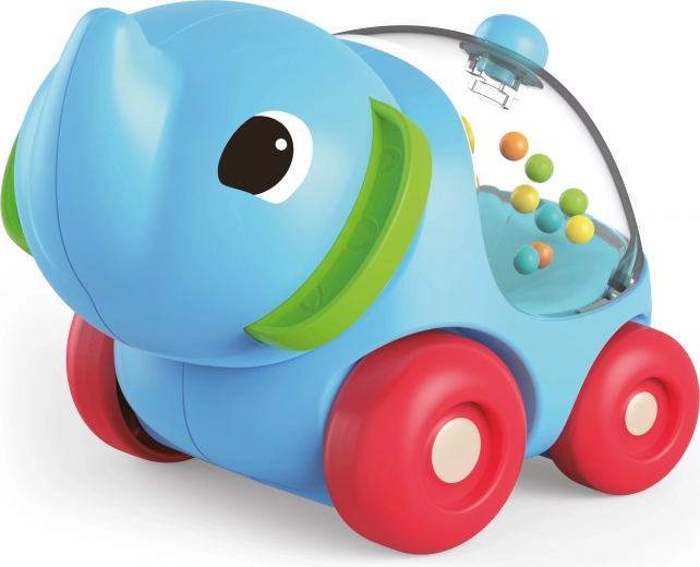 Šis spalvingas barškutis–drambliukas ant ratukų yra idealus pirmasis važiuojantis žaislas kūdikiams. Judant skleidžia barškėjimo garsą, kuris motyvuoja vaikus tyrinėti, ropoti ir pirmą kartą stumti žaislą prieš save.