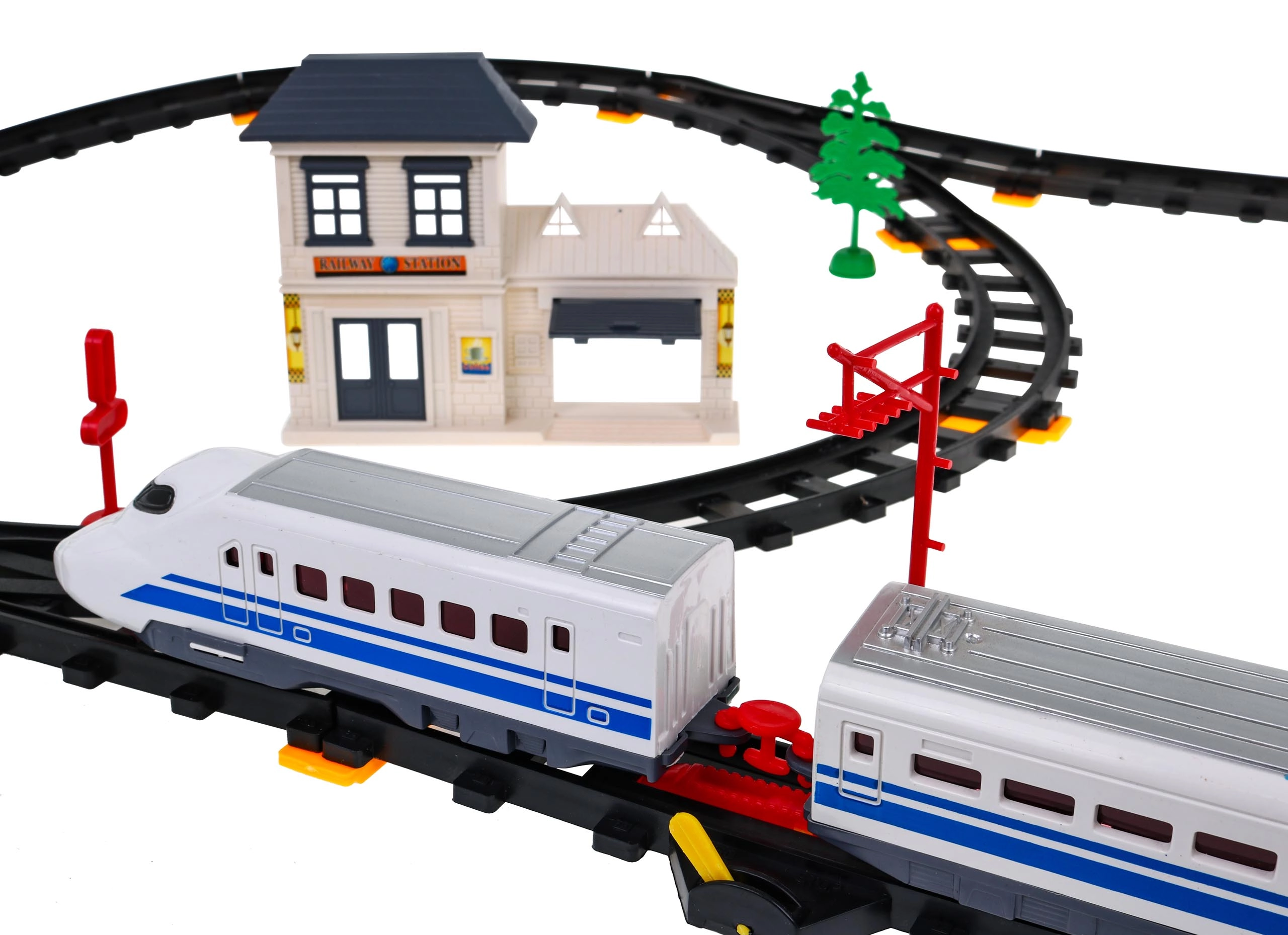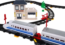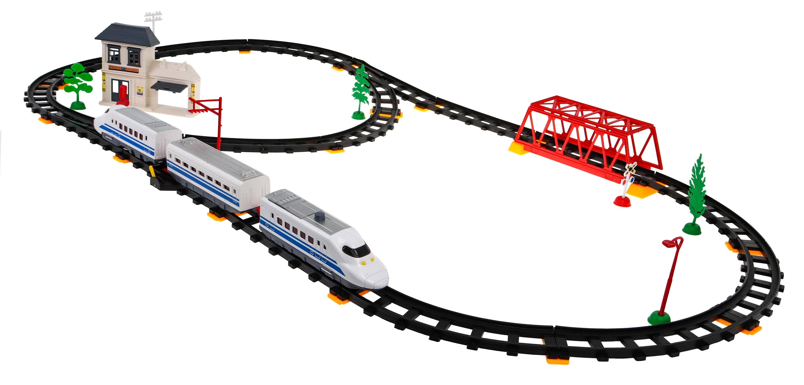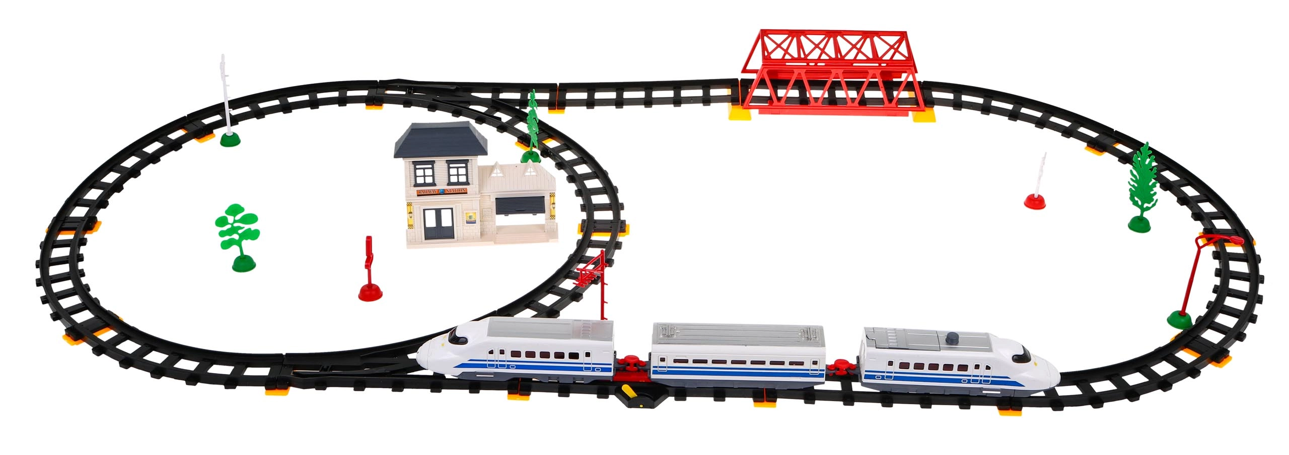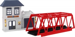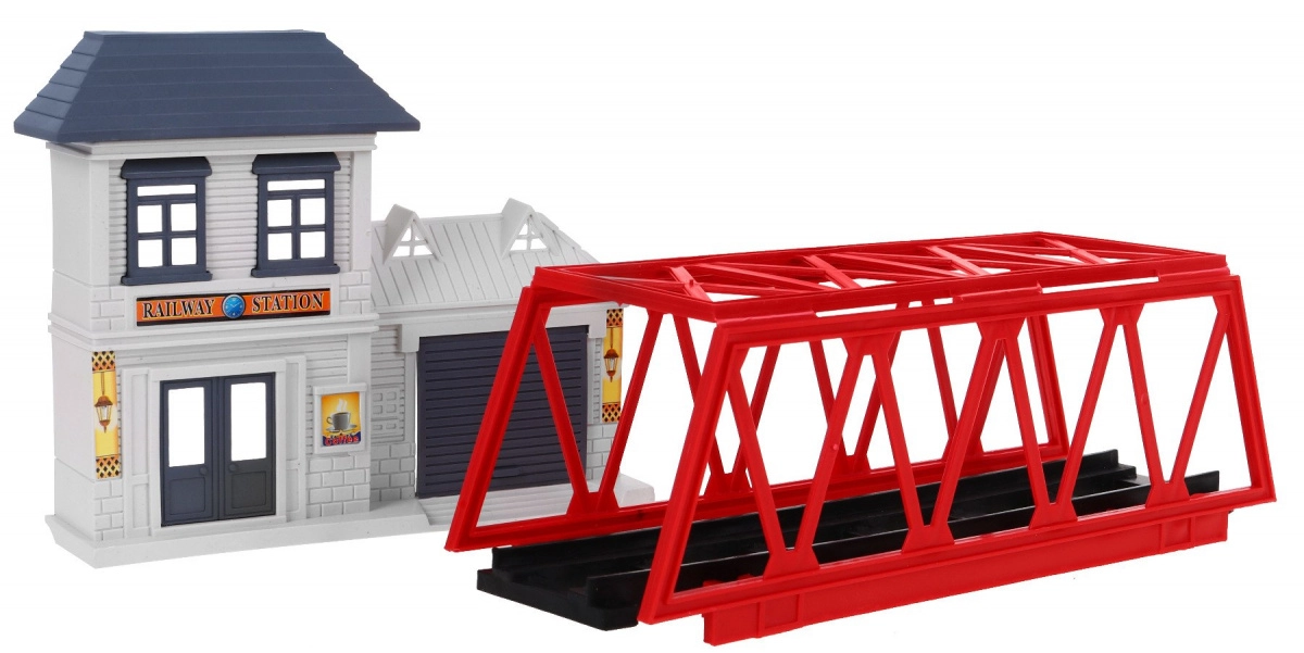 Komplekte yra lokomotyvai, vagonai, geležinkelio stotis, tiltas ir dekoratyviniai elementai, tokie kaip medžiai ar kelio ženklai. Šis žaislas suteikia interaktyvią ir kūrybišką patirtį vaikams ir tėvams.