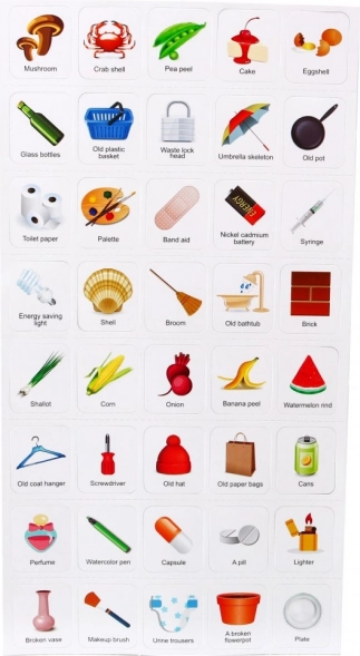Į komplektą įeina iliustruotų kortelių vadovas, aiškinantis, kaip teisingai rūšiuoti atliekas: žalias – virtuvės/bio atliekos, mėlynas – perdirbamos atliekos, pilkas – mišrios atliekos, raudonas – pavojingos atliekos. Taip vaikai natūraliai įgyja ekologiškus įpročius ir atsakomybę už aplinką.