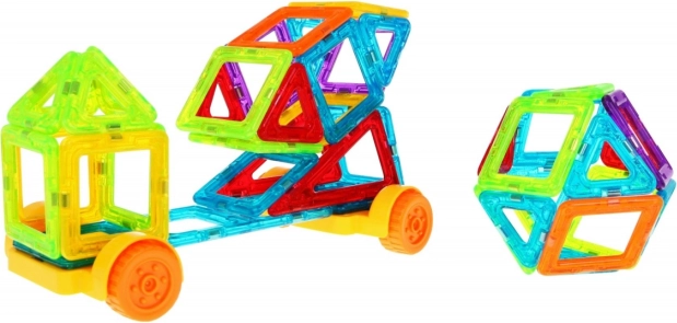 Ši spalvinga magnetinė konstravimo dėlionė suteikia vaikams valandas kūrybiško žaidimo. Skirtingų formų dalys intuityviai jungiasi ir leidžia statyti stabilius modelius – nuo paprastų 2D figūrų iki 3D konstrukcijų, įskaitant transporto priemones ir mėgstamą karuselę. Žaidimas lavina kūrybinį mąstymą, koncentraciją ir formų bei spalvų pažinimą.