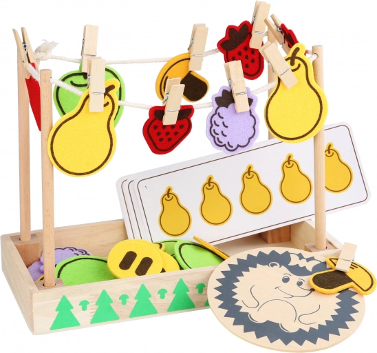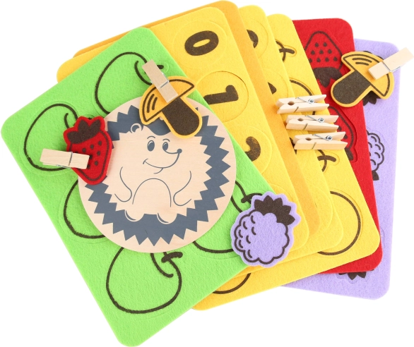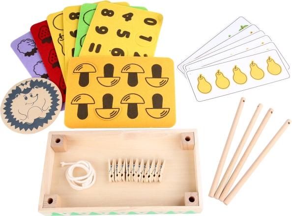 Rinkinyje yra medinis pagrindas, ežiukas, smagios kortelės ir spalvotos veltinio pagalvėlės – puikiai tinka ir keliems vaikams žaisti kartu. Patogiam laikymui viskas sudėta į praktišką medvilninį maišelį.