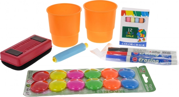 - Visas rinkinys – taburetė, lentynėlė, flomasteriai, kreidos, magnetai, puodeliai, kempinėlė ir spaustukai.