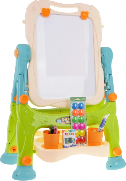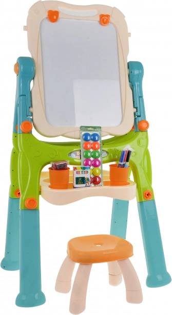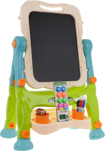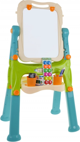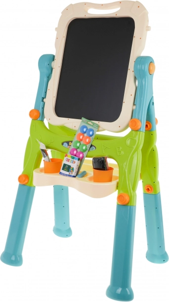 Šis kūrybinis rinkinys sujungia magnetinę baltą lentą rašymui flomasteriais ir magnetų tvirtinimui su juodu kreidiniu paviršiumi klasikiniam piešimui. Lenta sukasi 360°, turi apvalintus kraštus saugiam naudojimui, o dėl keičiamų ilgesnių ir trumpesnių kojelių ją lengvai pritaikysite prie esamo vaiko ūgio. Patogi lentynėlė laiko visus reikmenis po ranka, o integruoti spaustukai leidžia piešti ir ant popieriaus.