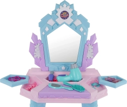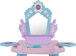 Tualetinis staliukas pastelinių spalvų taps gražia vaikų kambario puošmena ir skatins vaidmenų žaidimą, kūrybiškumą ir smulkiąją motoriką. Paspaudus mygtuką apatinėje veidrodžio dalyje, užsidega šviesos ir pasirodo princesės, lydimos melodijų. Vaikiškas džiovintuvas skleidžia garsą ir turi lengvą oro srautą, tad žaidimas kirpėja tampa dar tikroviškesnis.